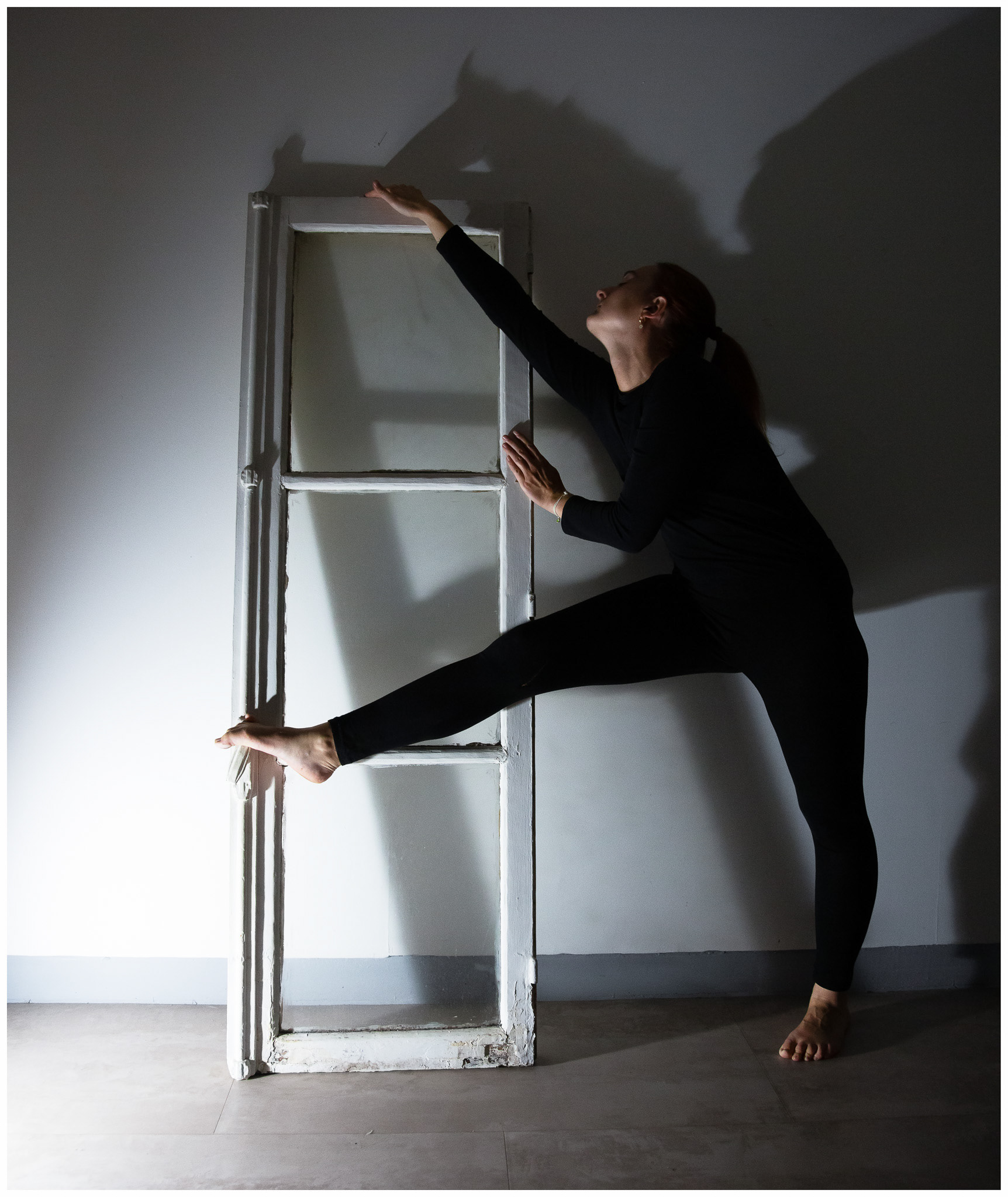 In der Arbeit 'Annäherung - Übung 1' untersucht die Künstlerin die Beziehung zwischen Körper, Objekt und Licht. Ausgangspunkt ist ein altes Fenster, das als materielles Relikt und zugleich als symbolisches Motiv für Durchblick dient.