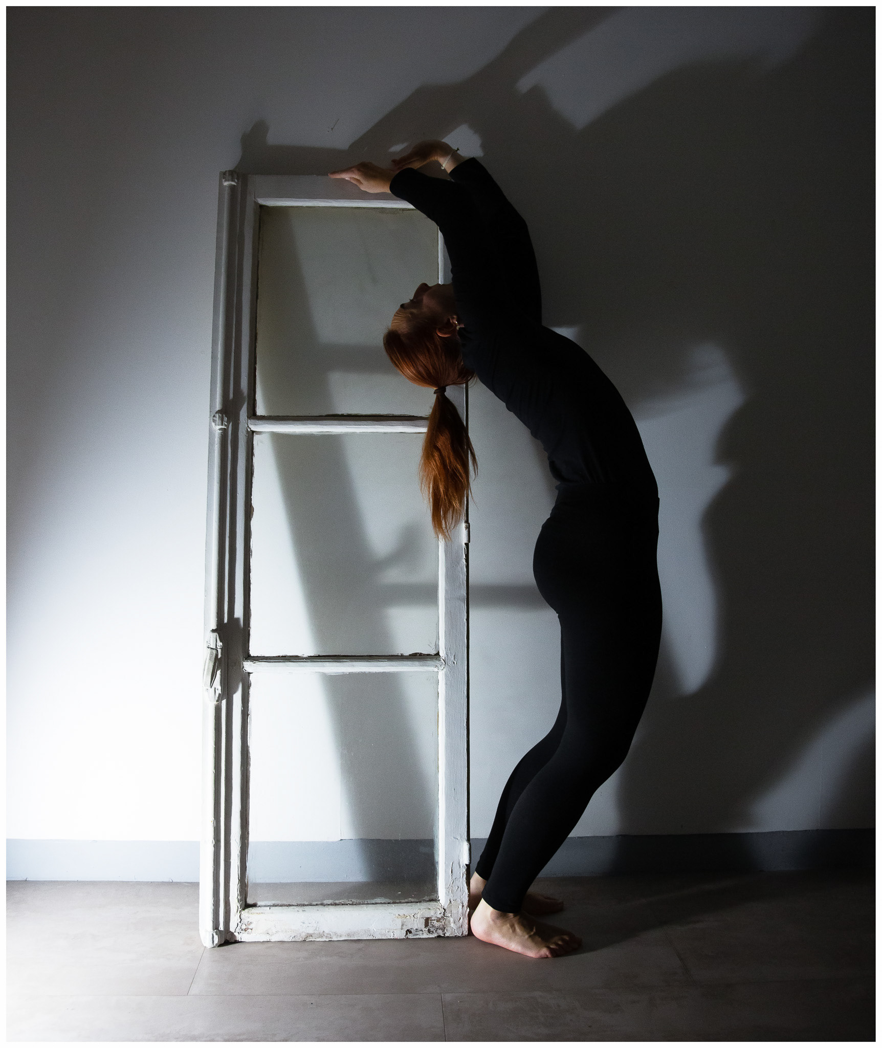 Die fotografische Serie dokumentiert eine performative Interaktion: Der Körper begegnet dem Fenster nicht als statischem Gegenstand, sondern als Partner in einem physischen und räumlichen Dialog. In der reduzierten Lichtsituation werden Schatten und Reflexionen zu gleichwertigen Akteuren, die das Verhältnis von Innen und Außen, Präsenz und Abbild verhandeln.