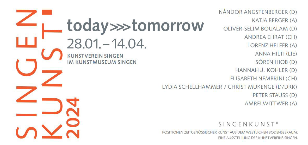 today >>> tomorrow: Der Titel der SINGENKUNST 2024 bietet einen offenen Rahmen für Gegenwartskunst und manifestiert gleichzeitig eine These des Kunstvereins Singen zur gegenwärtigen Vermittlung von Kunst. »today >>> tomorrow« möchte das Morgen, das immer auf das Heute folgt, als Möglichkeit von Zukunftsentwürfen setzen – mit dem künstlerischen Ausgangspunkt in der Gegenwart.