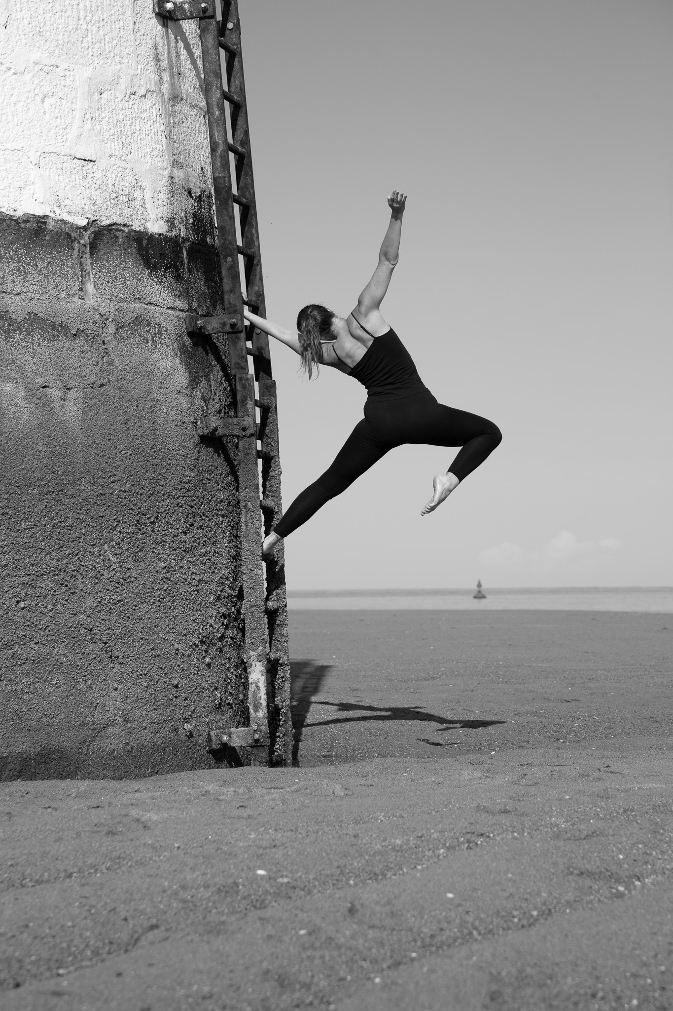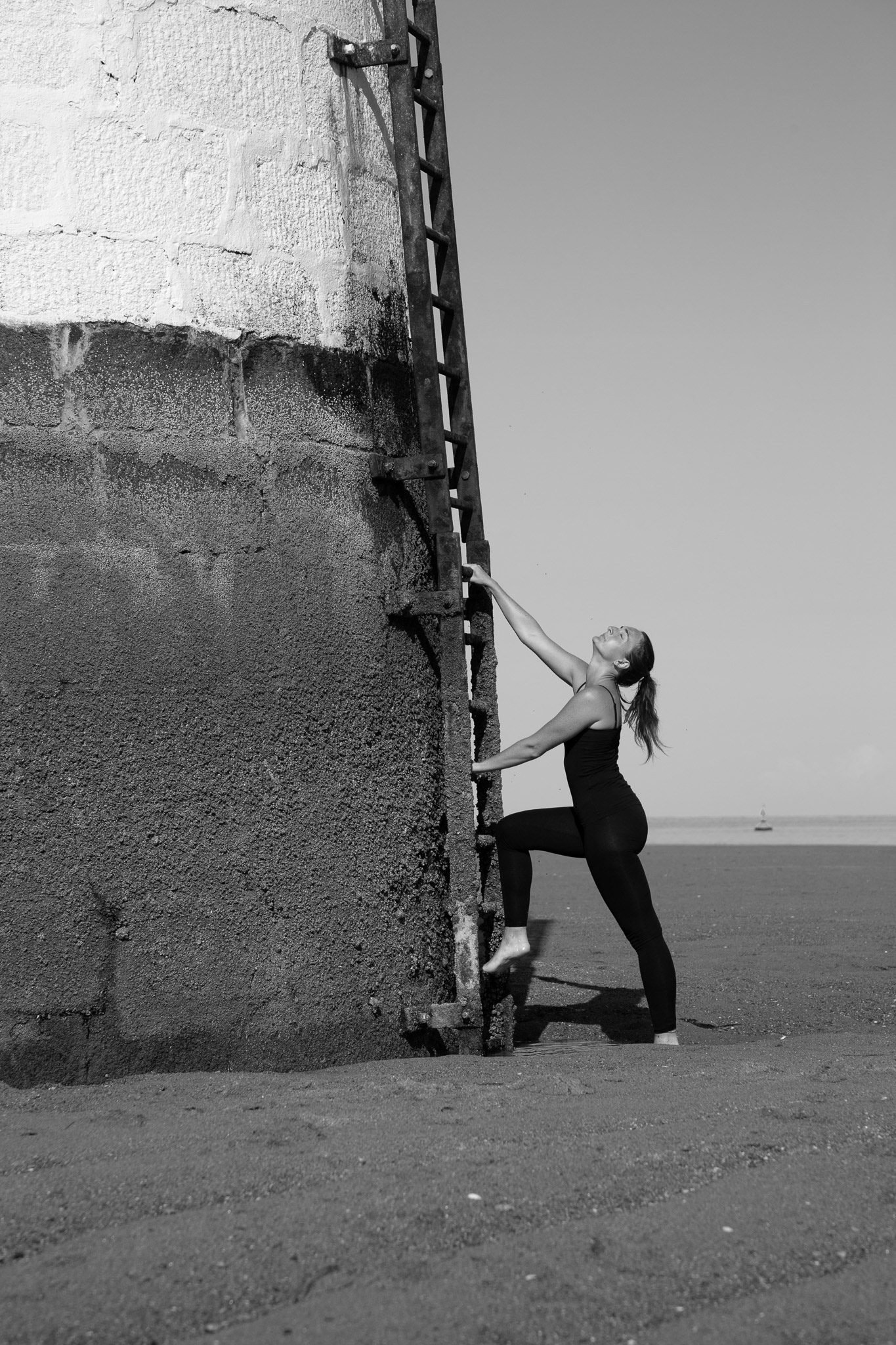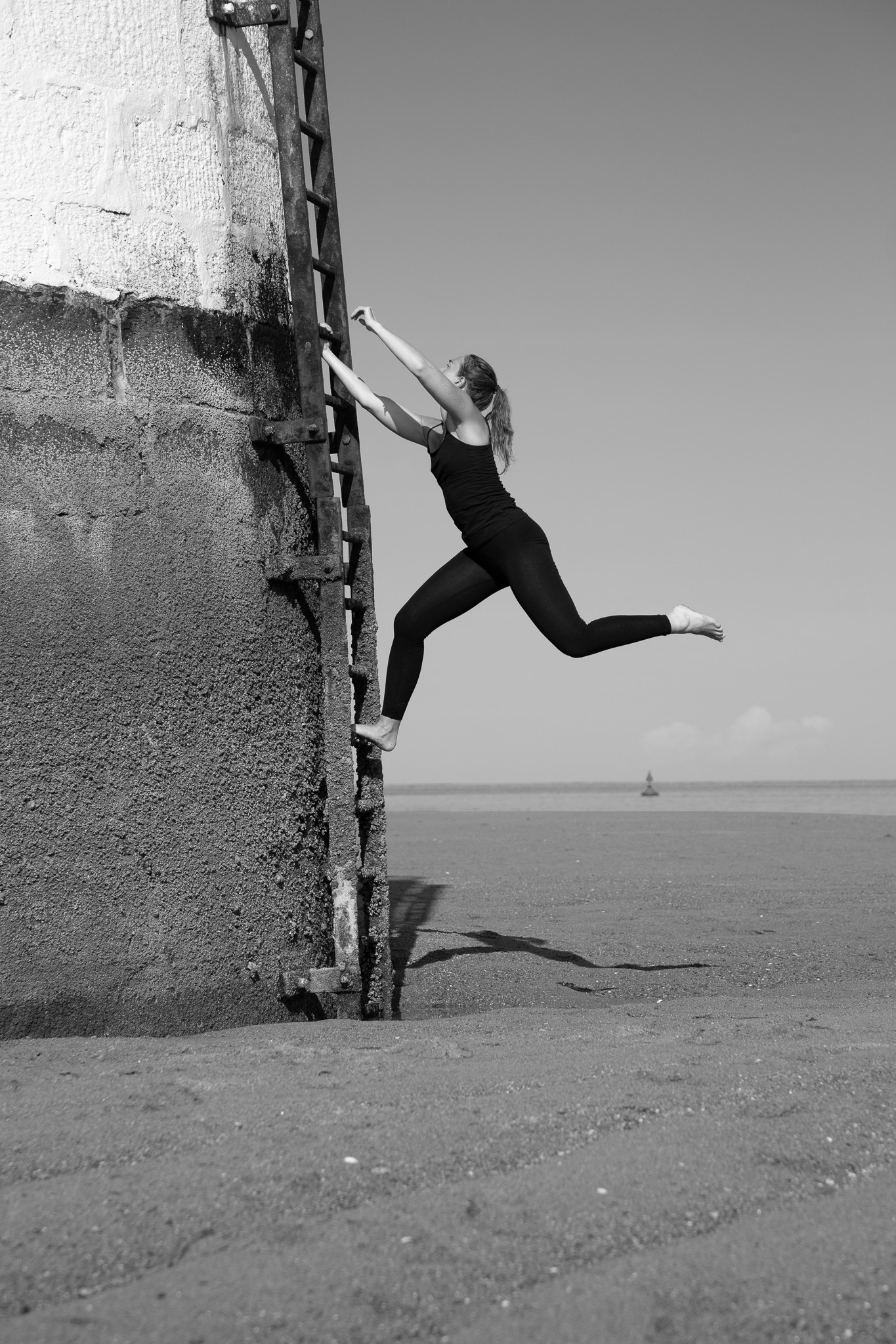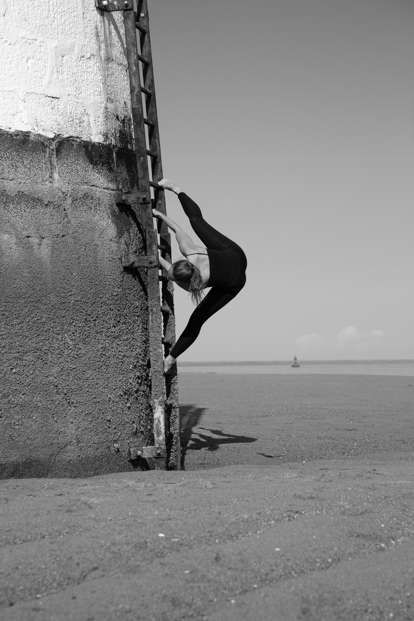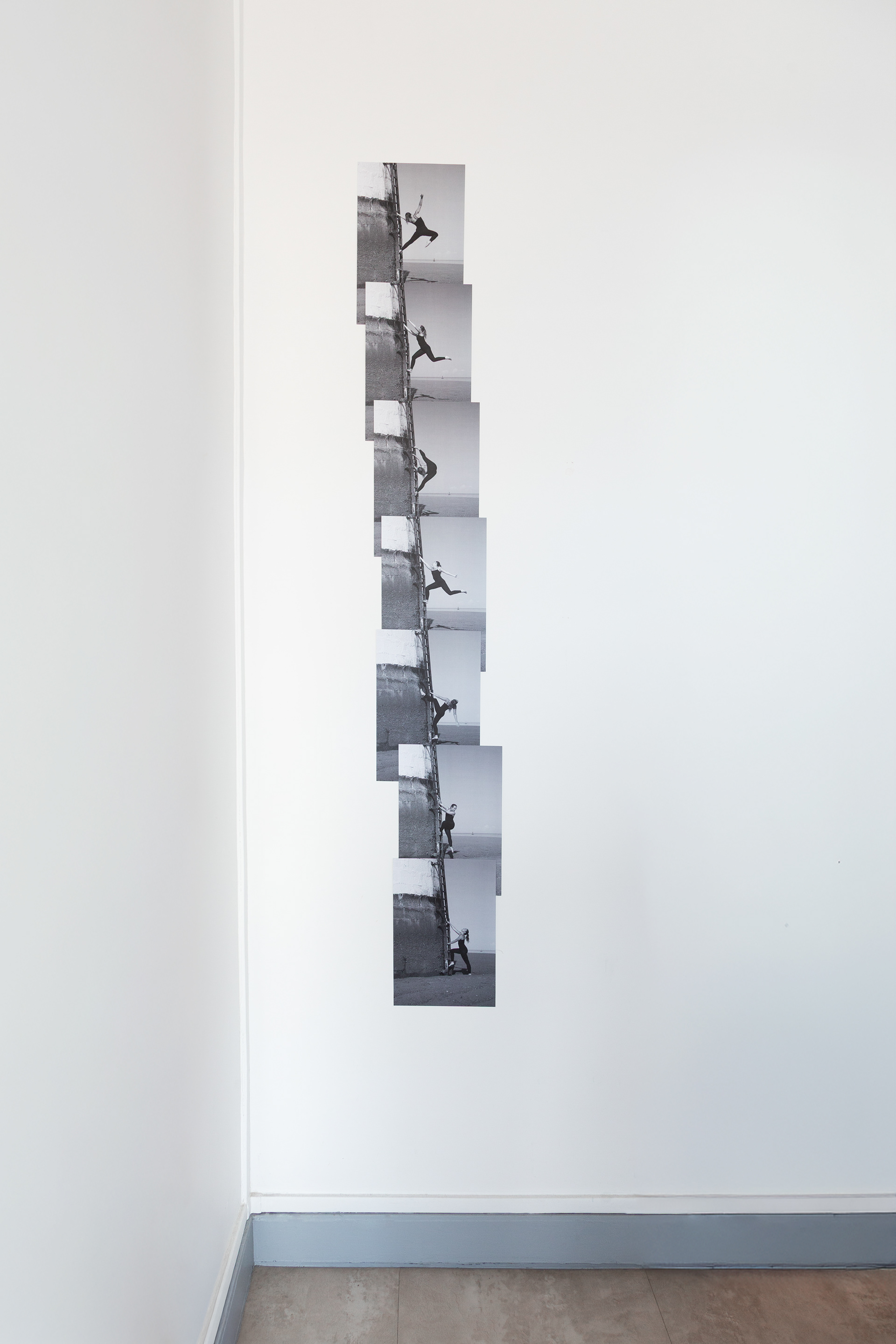 Die siebenteilige Serie "Upstairs" entstand bei Ebbe an einem abgelegenen Leuchtturm an der bretonischen Küste. In der Arbeit zeigt sich eine körperliche Annäherung an eine rostige Leiter, die in akrobatischen Bewegungen erklommen wird, ohne das Ziel je zu erreichen. Die Serie thematisiert das Verhältnis von Körper, Raum und Grenze. Der Aufstieg wird zu einer Geste der Beharrlichkeit, des Suchens und des wiederholten Scheiterns. Zwischen Bewegung und Stillstand entsteht eine spannungsvolle Studie über Anstrengung, und Ausdauer. Der Ort, ein Leuchtturm weit draußen im Watt, bildet den stillen Hintergrund für diese Auseinandersetzung mit Orientierung, Gleichgewicht und der Unerreichbarkeit des Oben.